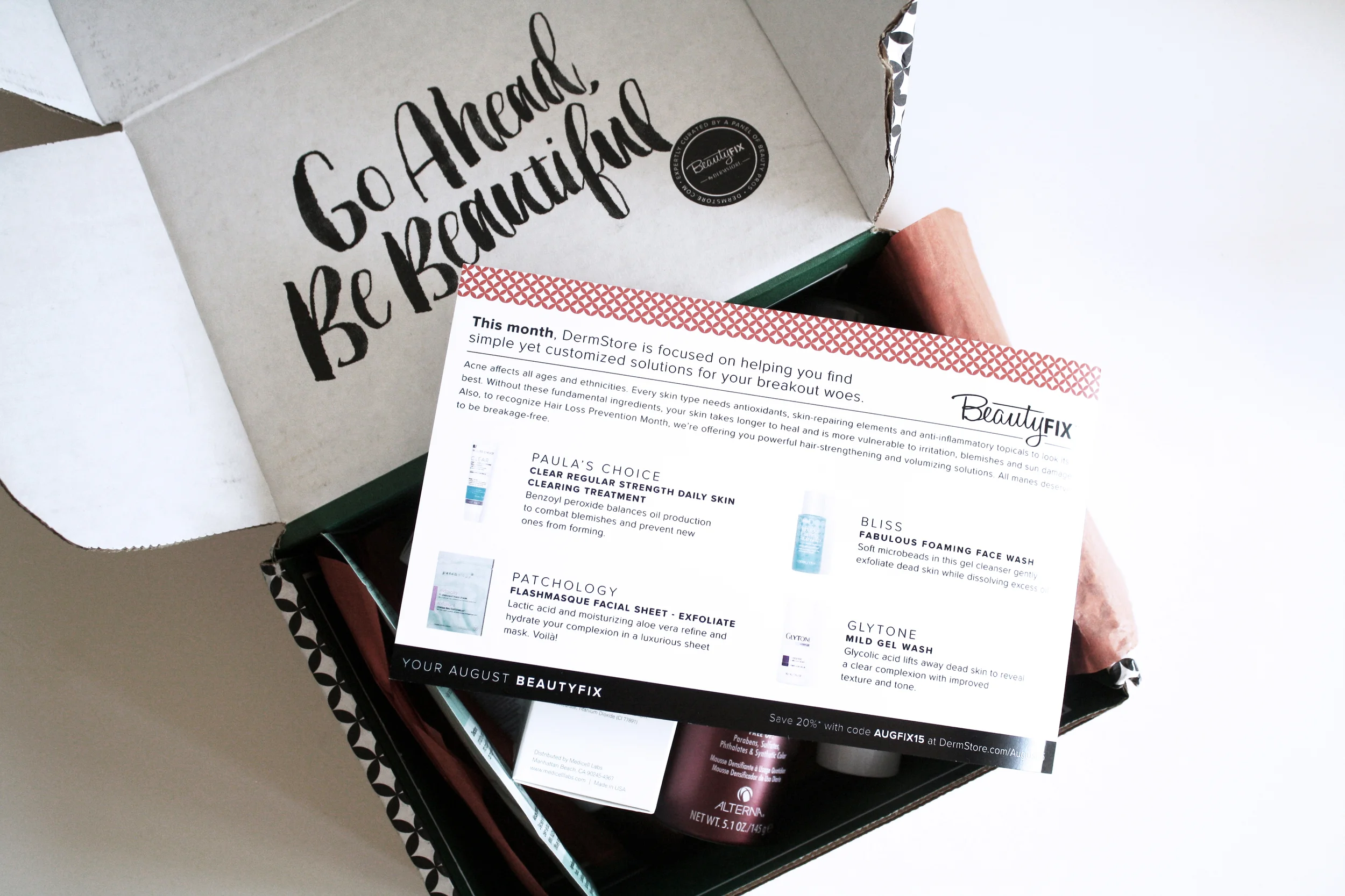 Since my recent move to Los Angeles, my skin has been completely acting up. I have really sensitive skin to begin with, so the move has really taken it's toll on my skin. I've been getting both a lot of small and quite large ugly spots. It's like Dermstore heard me cry out because this month, the Dermstore BeautyFIX box is focused on treating acne! The first thing I noticed when I opened this month's box was that the products are huge and almost seem like full size products! They're so much bigger than any other monthly subscription I've tried!