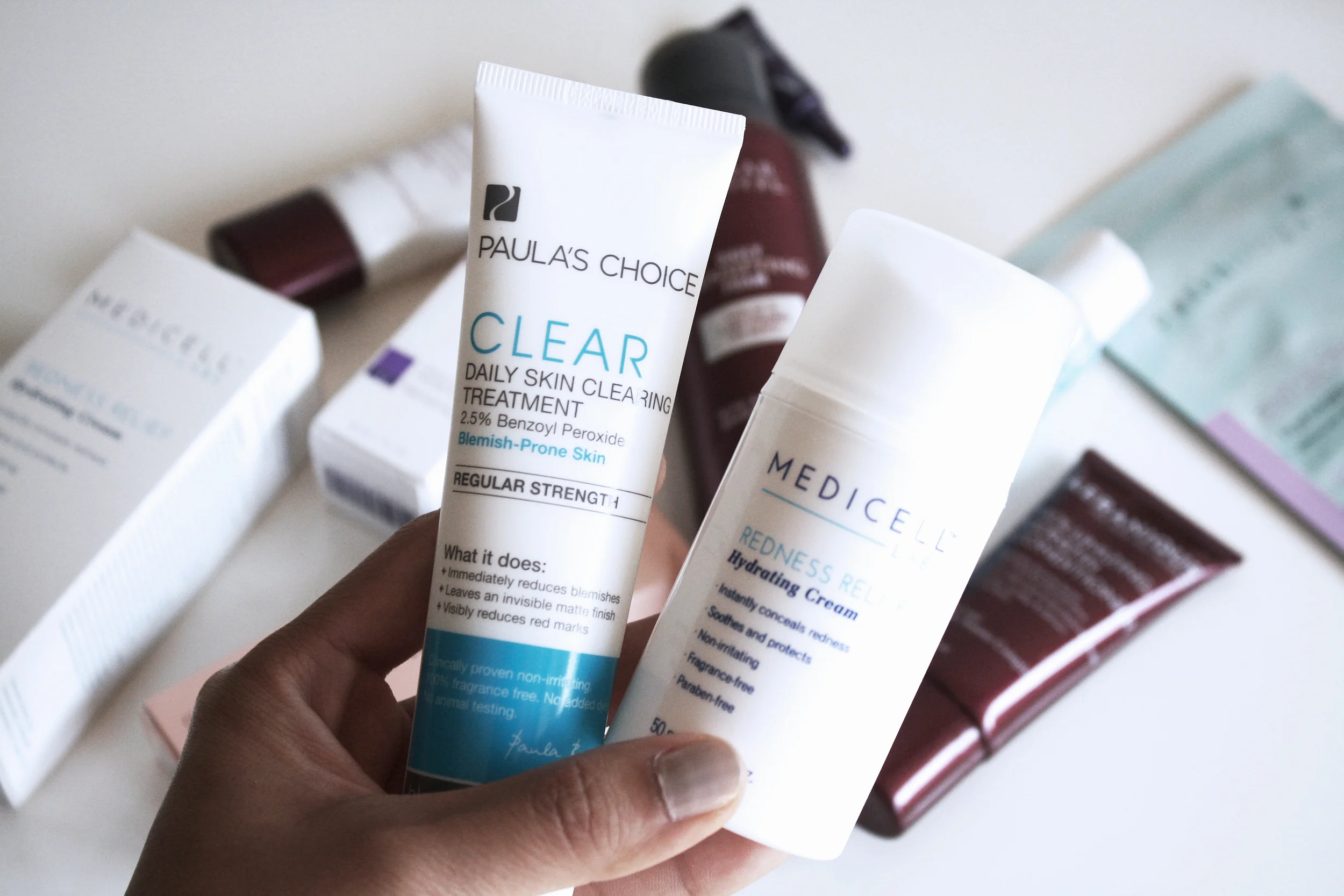 Two things caught my eye immediately. I've been using the Paula's Choice Clear Regular Strength Daily Skin Clearing treatment both morning and night since I got it. I noticed it did dry my skin out a little so I've been adding moisture masks into my night time routine. I definitely think it's been helping my breakouts because I had quite a big painful blemish on my cheek and now two days later it's completely flat! It's got benzoyl peroxide which is an amazing ingredient for breakouts. And because my skin has been a little swollen and red in the mornings, I also was very curious to try the Medicell Labs Advanced Redness Relief Hydrating Cream. It contains aloe vera, chamomile and rose hip oil, which are all very soothing and calming ingredients for the skin. This stuff really helps tone down the redness almost immediately and feels very gentle to use, however, it does leave your face quite oily so it's best to use this at night!