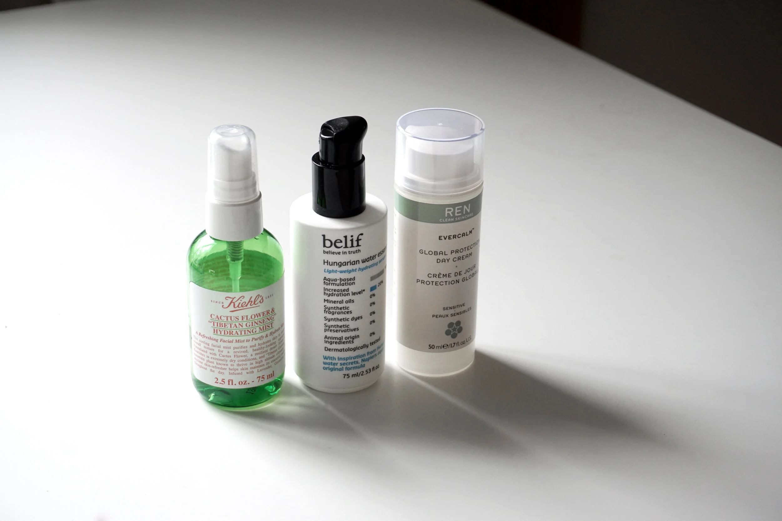Next for added moisture I like to use the belif hungarian water essence. This little guy packs in a lot of hydration and acts like a drink for my dry skin. It's a lightweight gel texture that feels really nice to apply. I like applying it in the morning because makeup still sits beautifully on top. And finally I lock in those 2 products with a moisturizer. Currently I've been using the REN Evercalm Global Protection Day Cream. I don't exactly love the texture of this product. It's kind of thick at first but it does blend into the skin alright. It's a bit more on the creamy side whereas I prefer more gel like products. I do like that it's great for sensitive skin and that it's fortified with a combination of powerful antioxidants to help hydrate my face.